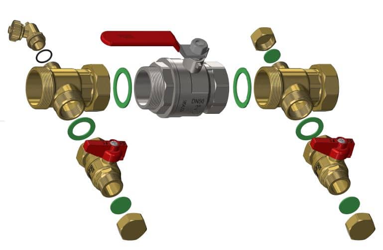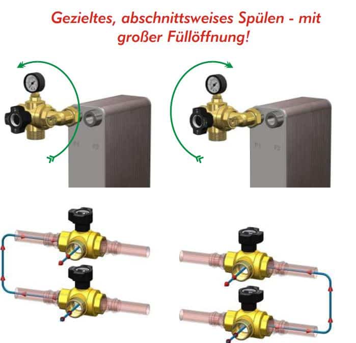 Mit einem KFE-Hahn eine 35er Leitung zu spülen kostet Zeit und Effizienz. Darum: Füll-& Spülstutzen mit Spülöffnungen in Dimension der eingebundenen Leitung!